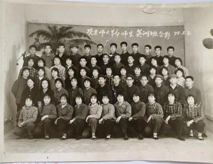 1975年外语系派11人赴深泽县对50名教师进行半年的英语强化培训,英语课在全县中小学全面开花欢迎师大革命师生英语班