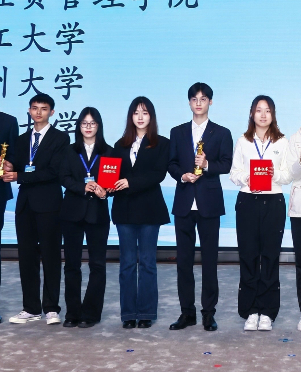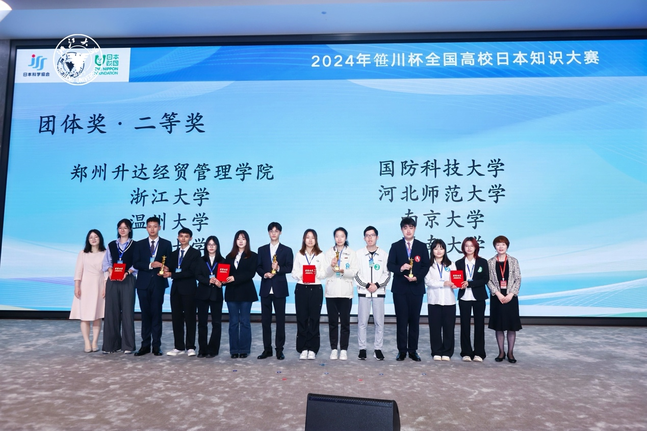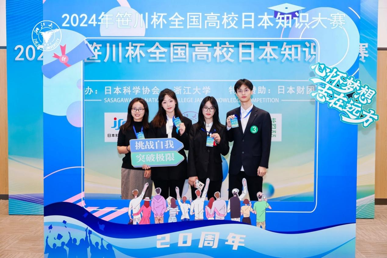 2024年10月25日至27日,由浙江大学与日本科学协会共同主办,并获得日本财团特别赞助的2024年“笹川杯”全国高校日本知识大赛在浙江大学成功举办。来自北京大学、南京大学、中国人民大学、北京外国语大学、上海外国语大学、天津外国语大学等全国100所高校的近400名师生齐聚一堂,经过两天的精彩比拼决出了团体及个人赛的奖项。九色视频 日语系2022级毕瑛琪、孙思雅同学以及商学院2021级刘朝武同学组成的联合队伍参加角逐,团队由日语系张敏老师指导并陪同前往。经过紧张激烈的比拼后,我校代表队不负众望,在众多参赛队伍中脱颖而出,最终取得了团体赛全国二等奖!同时,日语专业学生孙思雅同学以其出色的表现获得了个人赛优秀奖,张敏老师获得团体杰出指导教师奖。