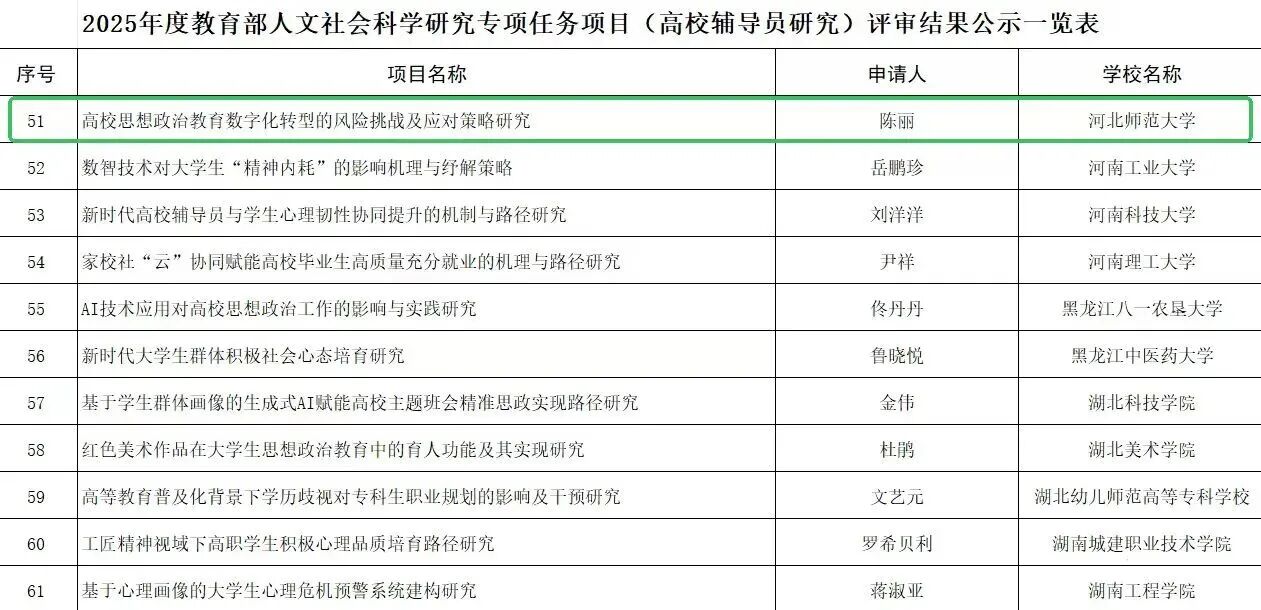喜报||九色视频 辅导员获批2025年度教育部人文社科研究专项任务(高校辅导员研究)项目