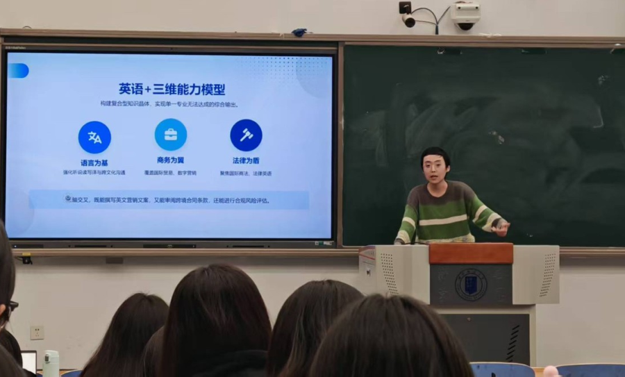 日语专业人才培养的定位与特色:以“日语+法学”为基础,探索“外语+X”的复合型培养模式,致力于帮助学生打造“1+1>2”的综合竞争力。付老师提到,现阶段人工智能迅速发展,但此类技术在语境理解与跨文化沟通上仍存在局限,这便凸显了语言学习与文化交流的重要性。希望同学们以语言学习为支点,培养跨文化理解与信息整合能力,早日成长成为高素质的复合型外语人才。