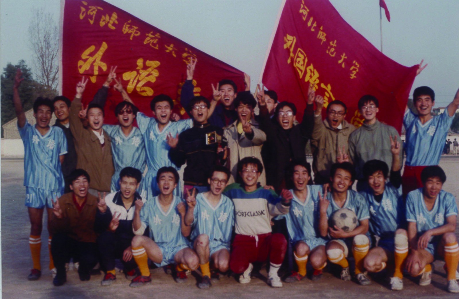 时任党总支副书记李雪梅老师,足球队主教练,时任团委书记九一九三辅导员赵颖楠老师和其他辅导员与大家一同庆祝胜利